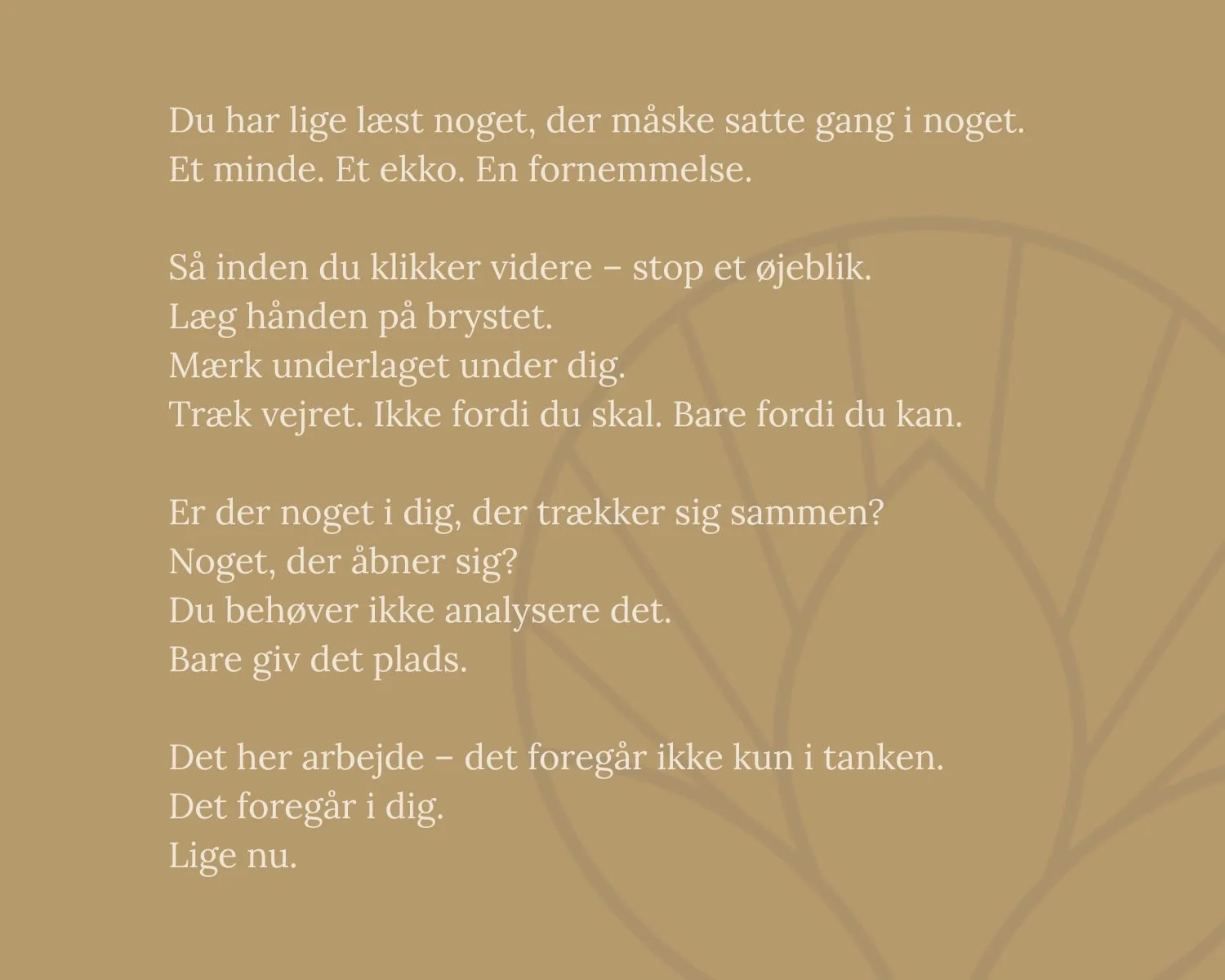 Jeg arbejder med kroppen som kompas. Og jeg tror på, at din fornemmelse er værd at lytte til – også hvis ingen andre endnu har gjort det.
